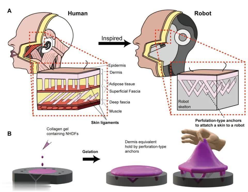 在实验室培育后,被“披”在微笑机器人上,视觉触感和真人无异,而且还能做出机器人无法做出的复杂表情,最关键是,作为活的组织,它具有和人类皮肤一样的自我愈合能力。
