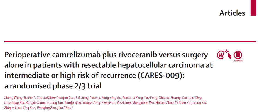 会议当天,该研究成果同时以原创论著(Article)形式在国际顶级期刊《柳叶刀》在线发表。Clinical Trial(第2版)主编、美国俄亥俄州立大学威克斯纳医学中心Timothy M. Pawlik教授和德克萨斯大学MD安德森癌症中心Ahemd Kaseb教授在《柳叶刀》同期发表评论:CARES-009等研究凸显了肝癌多模式治疗方面取得重要进展,这对推动围手术期系统治疗继续发展并在肿瘤治疗中占据更重要的地位,具有引领价值。