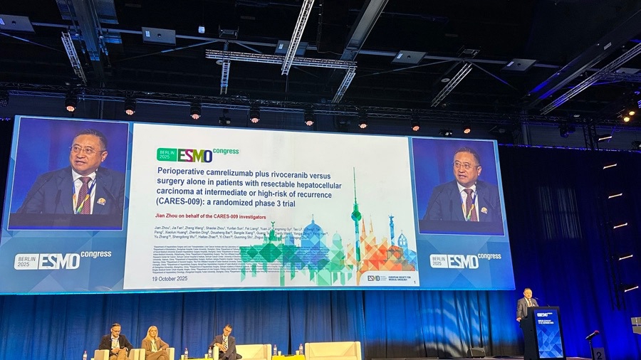 10月19日欧洲肿瘤学会(European Society for Medical Oncology, ESMO)年会上,中国肝癌研究再度传来佳音。在复旦大学附属中山医院樊嘉院士的指导下,由周俭教授牵头的研究者发起的临床研究最新成果——“卡瑞利珠单抗联合阿帕替尼用于可切除肝细胞癌伴中高危复发风险患者的围手术期治疗:一项多中心、开放、随机对照2/3期研究(CARES-009)”正式发布。周俭教授受邀作大会报告,代表团队解读CARES-009研究结果,向国际同行分享中国肝癌围手术期治疗经验。作为全球首个在肝癌围手术期治疗III期研究中取得阳性结果的临床试验,其重磅数据一经发布,便引发全球关注。