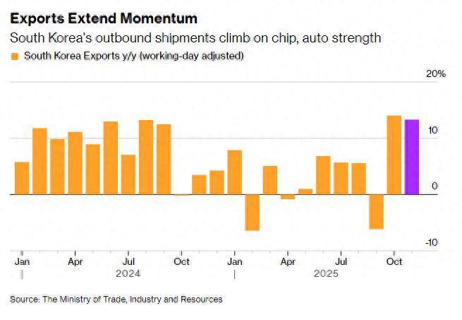 从出口目的地来看,受美国关税影响,钢铁和汽车零部件等行业出口疲软,导致韩国对美出口微降0.2%;对中国出口增长6.9%,对中东出口激增约33%,对东南亚出口增长6.3%。